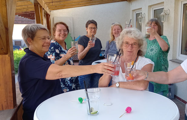 bestem Wetter konnten sich die Frauen aus 6 verschiedenen Rezepten ihre eigenen alkoholischen oder alkoholfreien Cocktails mixen und mit frischem Obst und Schirmchen dekorieren.
